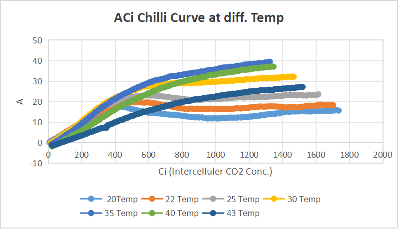 Step 4 : Temperature response curves were obtained at Three different photosynthetically active radiation (PAR) levels— 1800µmol m⁻² s⁻¹ ,900 µmol m⁻² s⁻¹ and 450 µmol m⁻² s⁻¹.