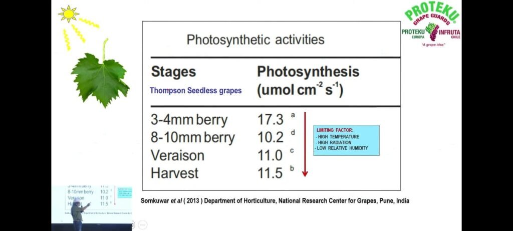 1. The Hard Reality Photosynthesis in grapevines increases gradually after flowering, reaches its maximum during early berry growth, and then declines sharply after veraison (when berries begin to change color). As berries ripen, leaf efficiency decreases due to ageing of leaves, reduced chlorophyll activity, and environmental stress. Consequently, at harvest, photosynthetic activity is much lower than during the active growth phase.