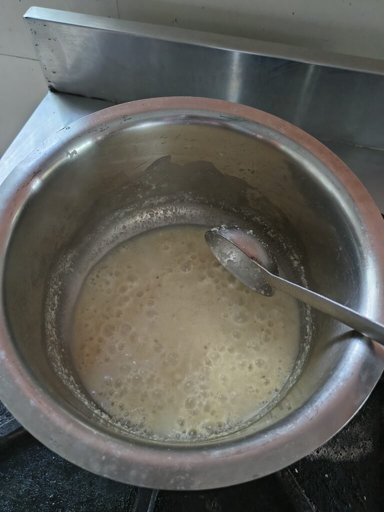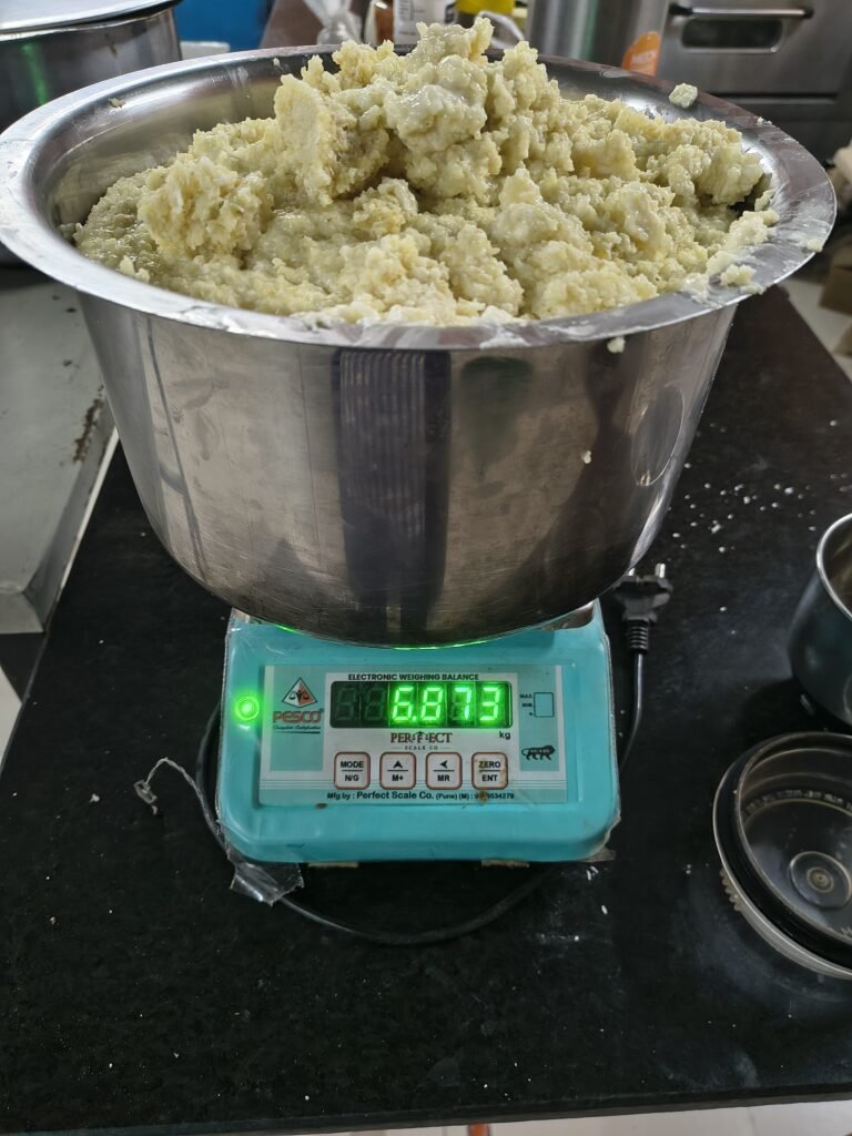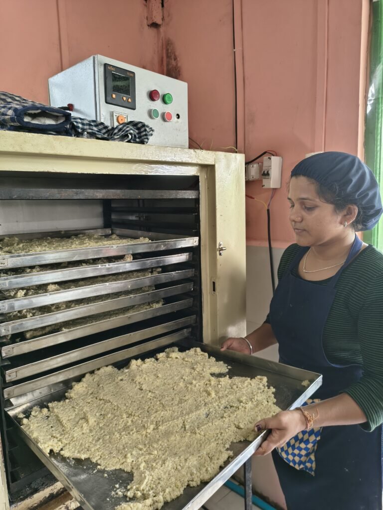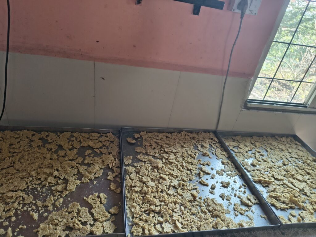 Spread the cooked mixture thinly on clean trays.Dry using a food dehydrator or electric tray dryer ~60 °C until moisture is below 10%.Avoid over-drying or burning.
