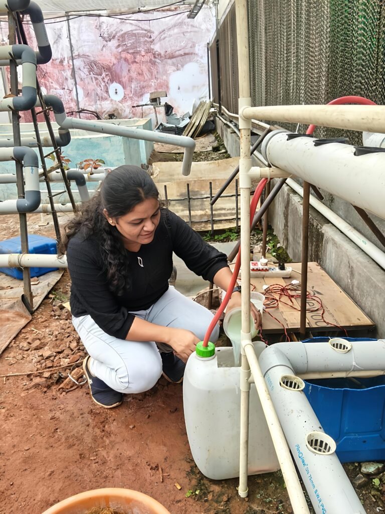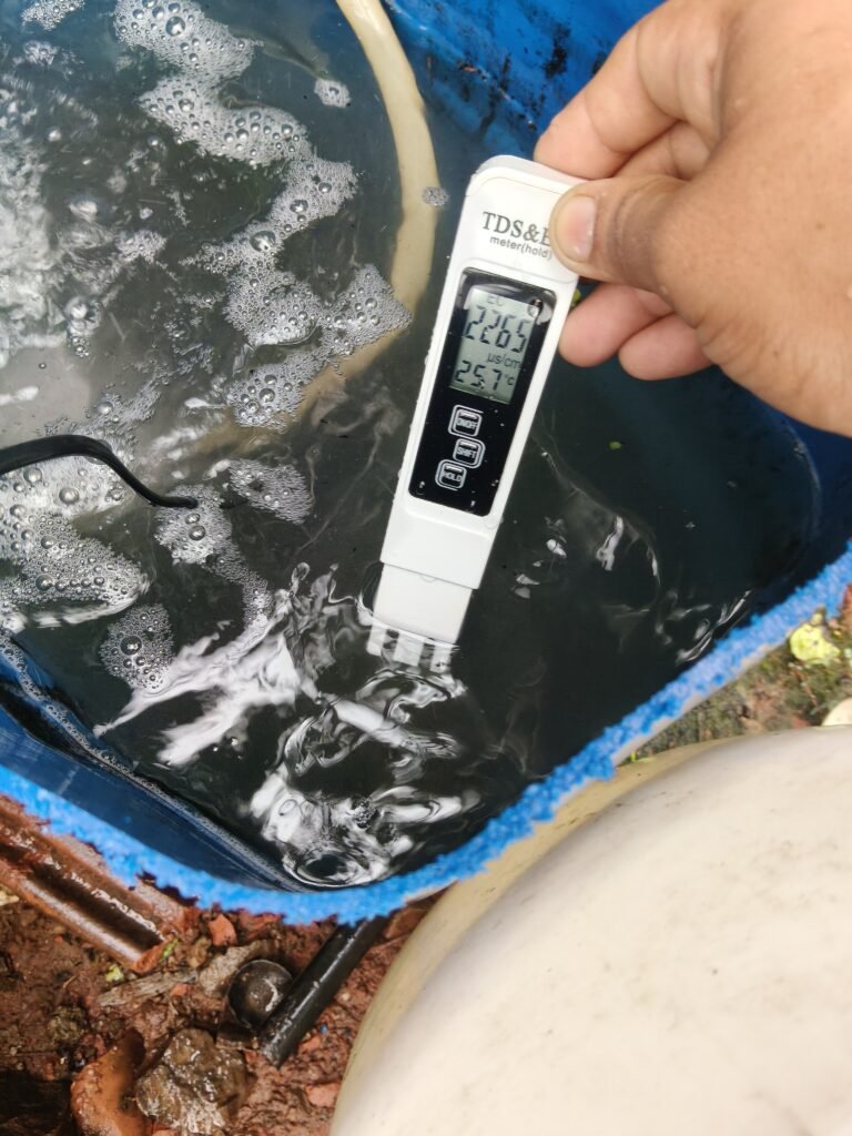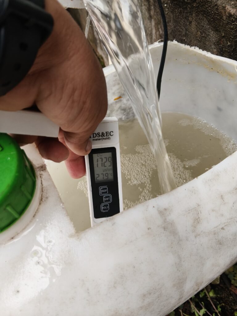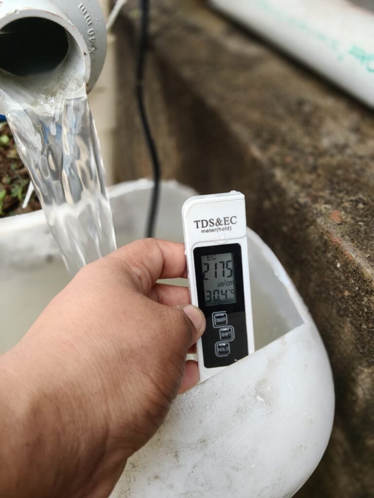 1.Adding nutrients to 20 L water in the reservoir to feed spinach plants in the NFT hydroponic system.