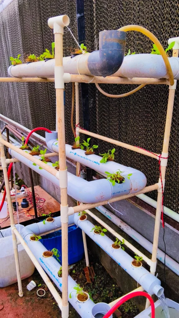 Hydroponic farming is the practice of growing plants without soil, using nutrient-rich water solutions in a controlled environment. This method reduces water usage by up to 90%, eliminates soil-borne diseases, and ensures year-round production of high-quality crops.The project focuses on developing optimized hydroponic systems, mainly the Nutrient Film Technique (NFT), along with other models like Deep Water Culture (DWC) and drip hydroponics, etc .