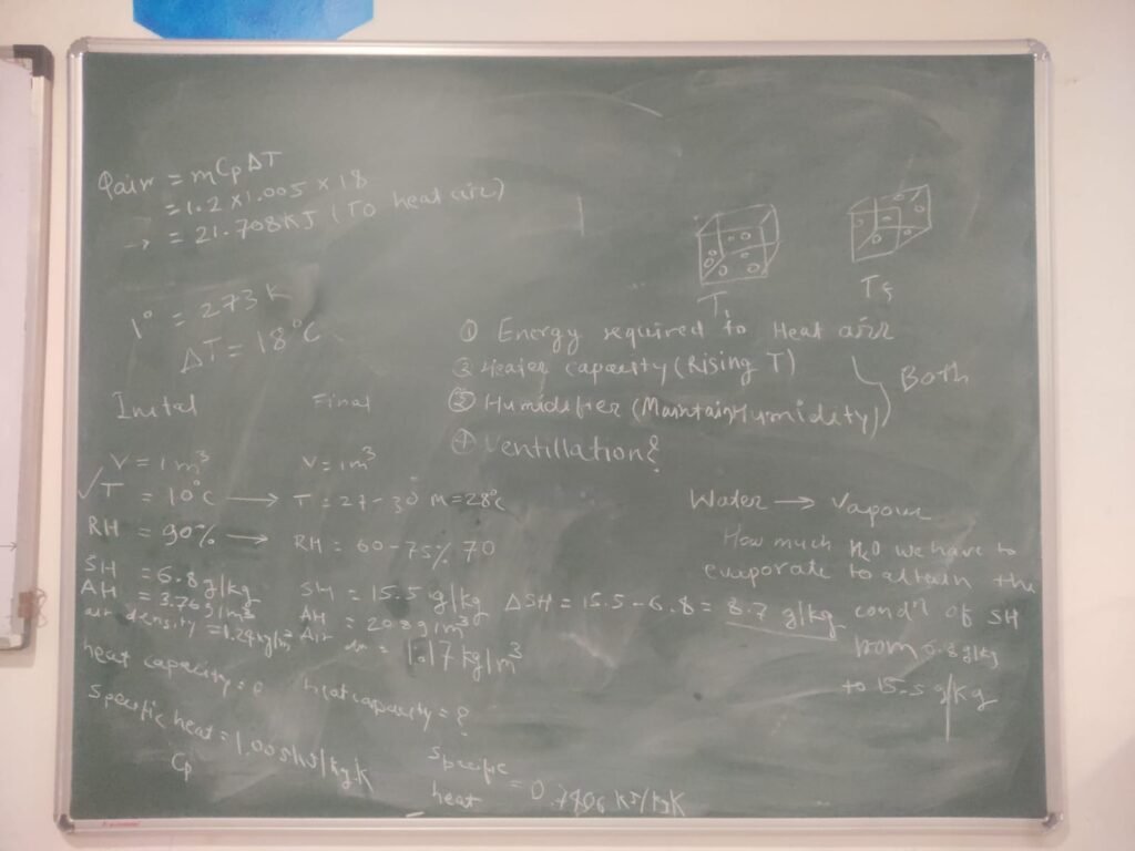 Starting with the humidity, I look at the various steps to reduce the temperature inside the room from two ways: direct humidification and indirect humidification. For humidification, I must know the specific volume of the air inside the room and the outside temperature. The initial phase if the research prasad sir told me about the specif requirementys of 1000kg so for that when I calculate the dimeter it is –