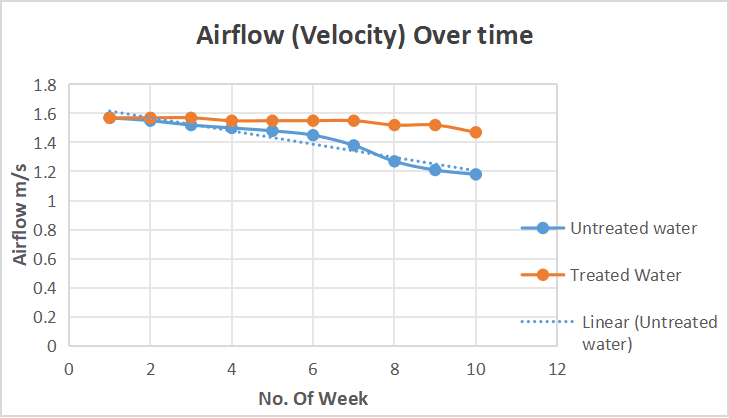 - In the Untreated water setup, the airflow velocity gradually decreased from 1.57 m/s in Week 1 to 1.18 m/s by Week 10.