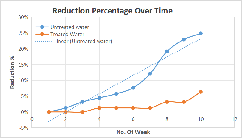 - After 6 weeks, the untreated pad had already shown around 7–8% reduction, which continued to rise rapidly, reaching nearly 25% by the 10th week.