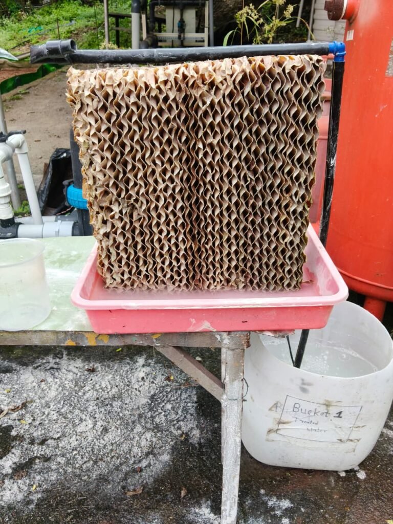 The experiment aimed to study the effect of algae growth on the performance of cooling pads by measuring airflow velocity over a period of 10 weeks using an anemometer. The comparison was made between two systems — one using treated water( Bleaching Powder) and the other using untreated water.