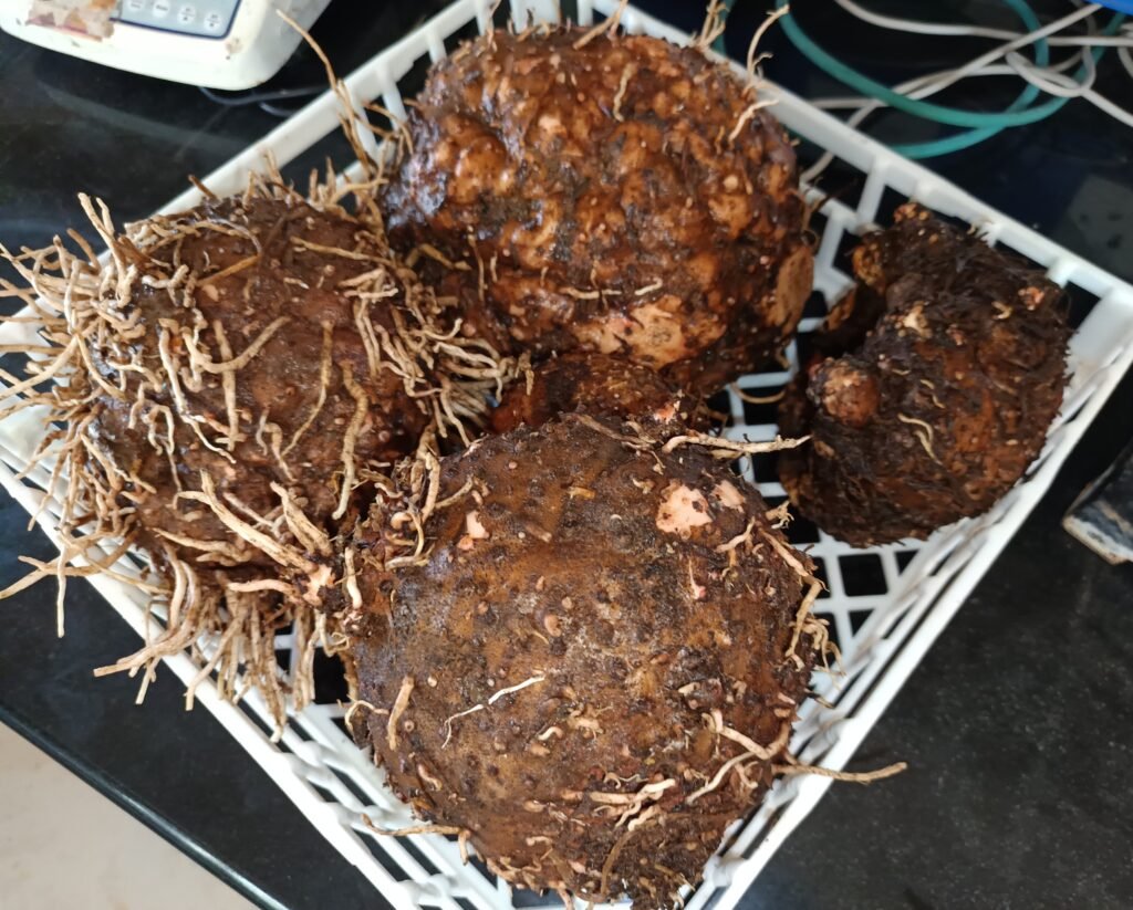 After nine months of cultivation, Suran (Amorphophallus paeoniifolius) tubers weighing 2 kg at the time of planting produced a total yield of 10 kg at harvest.