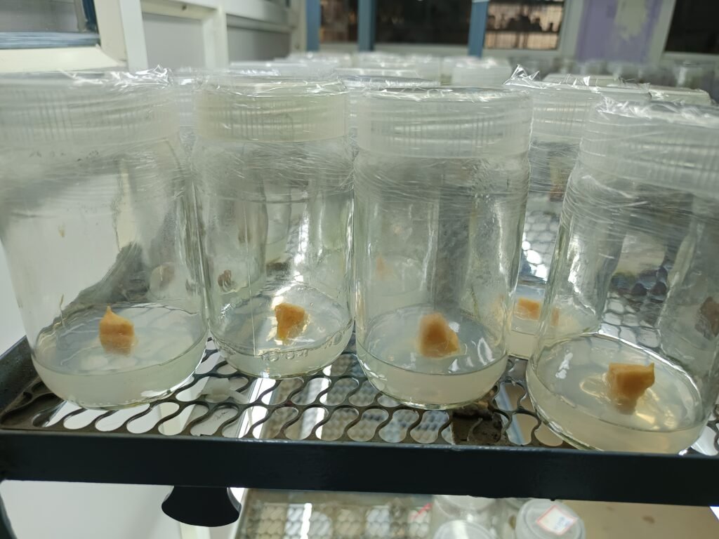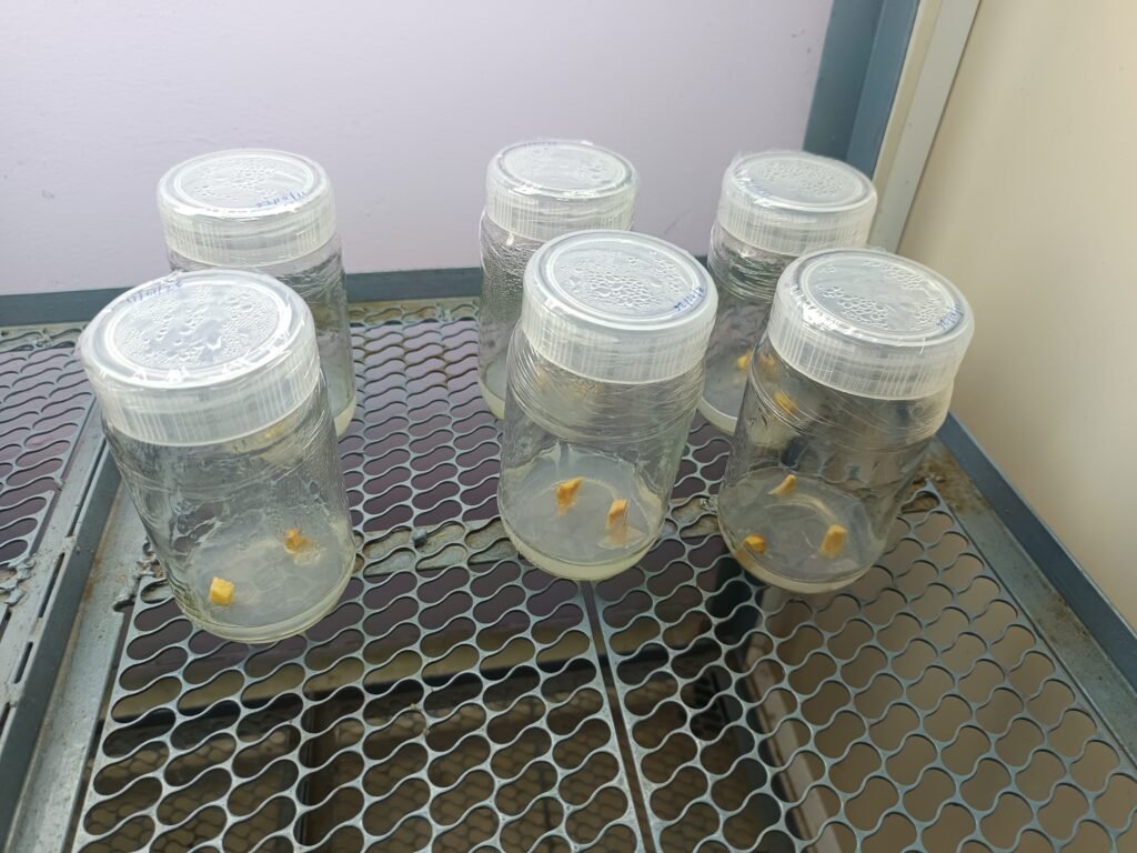Healthy yam (Suran) tubers are selected as explants and washed under running water for 15 minutes. Then, they are soaked in a 0.25% sodium hypochlorite solution for 30 minutes. After that, they are soaked in 200 ml of distilled water containing 2 g of Bavistin for 30 minutes. The tubers are then washed 3 to 4 times with distilled water. Finally, surface sterilization is done, and the explants are inoculated into MS medium.