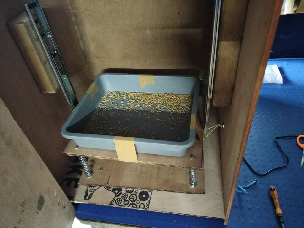 - the grain disinfection unit, which provides a drying chamber with air circulation and vibrating inclined trays to maintain a continuous flow of larvae,