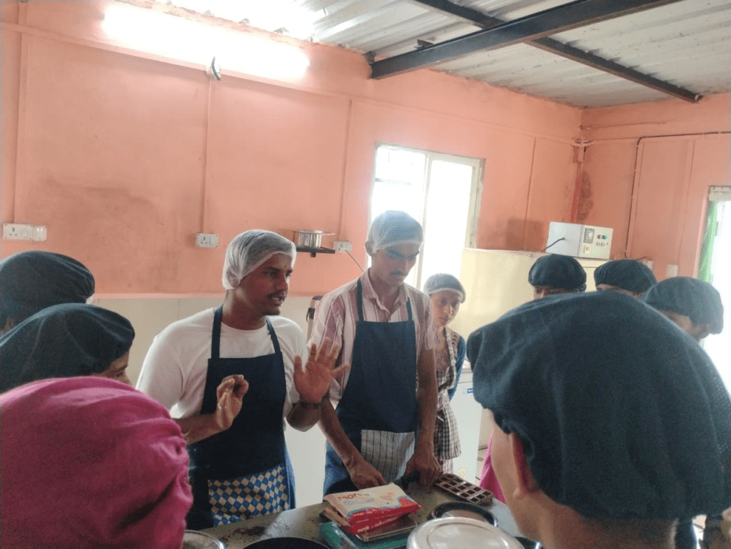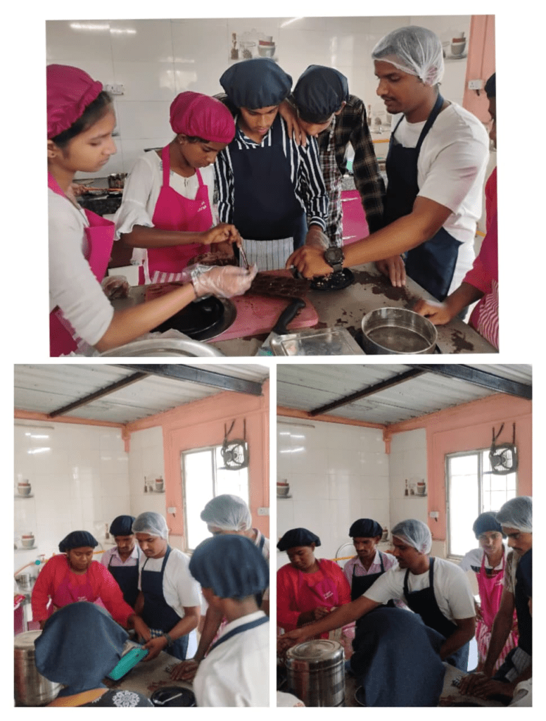 At the beginning of the session, I explained the importance of hygiene and cleanliness during food preparation. Then, I demonstrated the step-by-step process of making chocolates — including melting of dark and white compound, roasting ragi/bajra flour in ghee, proper mixing, and filling the molds. The students also learned about decorating the chocolates with dry fruits and the packaging process to maintain quality and appearance.