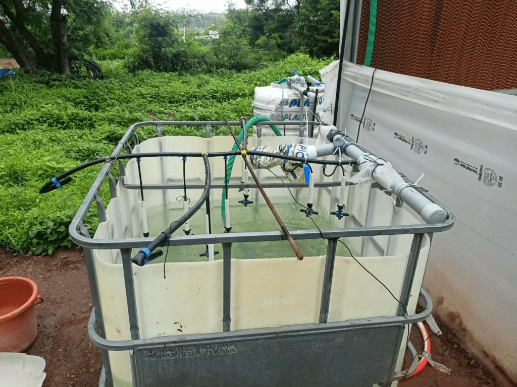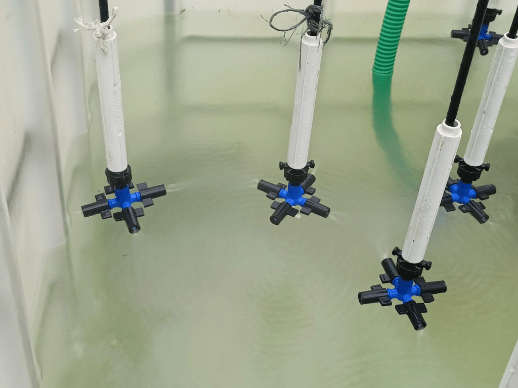 - A cross-shaped lateral pipe setup was made and fixed at the top of the tank to mount foggers.