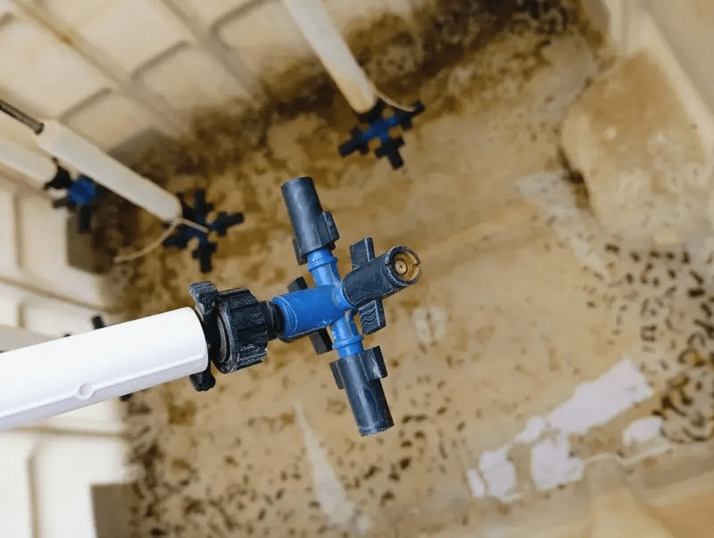 The next step is to identify and fix all leakage points to ensure the system runs smoothly and the foggers receive proper operating pressure. After solving this issue, the performance of turbo foggers will be tested again to record their efficiency and mist formation.