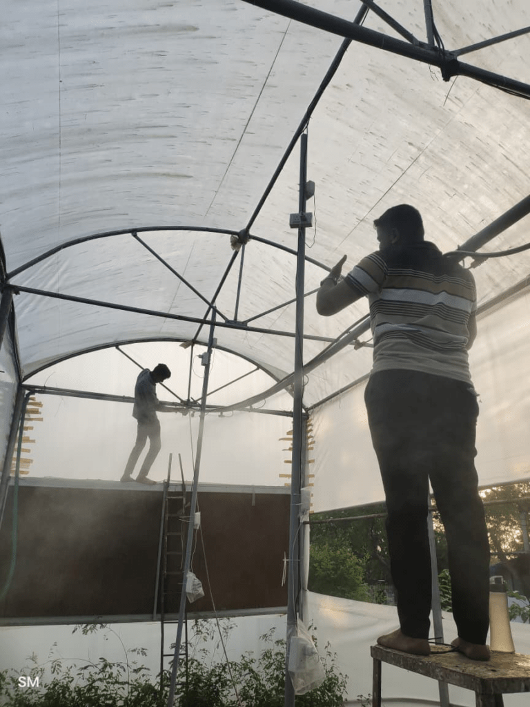 Currently, in the polyhouse, we are working on testing and comparing three different types of foggers to determine which one performs best for our trials. The main purpose of this setup is to study the efficiency of each fogger in terms of mist quality and uniformity inside the polyhouse.