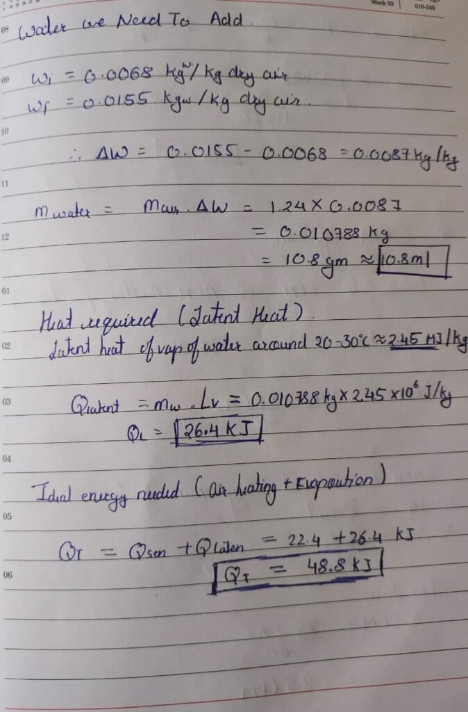 These numbers include both sensible heating and latent heat required for water evaporation, ensuring that both temperature and humidity targets could be reached simultaneously. All calculations were validated using standard thermodynamic values such as air density, specific heat capacities, and latent heat of vaporization.