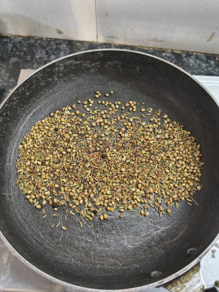 step 2 – Dry roast the jeera, Dhana, Badishep, black pepper, Mohari. Cool the mixture and grind coarsely or finely.
