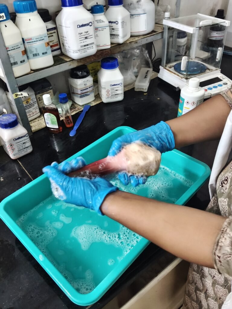 • First, we have cleaned glasswares such as test tube, Petri plates, conical flask, beaker, measuring cylinder, forecep, spatula , scalpel, surgical blades etc.Then, the cleaned items were dried in a hot air oven at180°C for 10 to 12 hours to ensure no water droplets remained. Then we have wrapped glassware in autoclave bag then put in autoclave with distilled water and culture media.