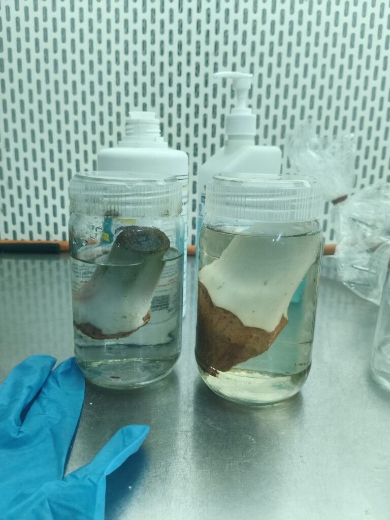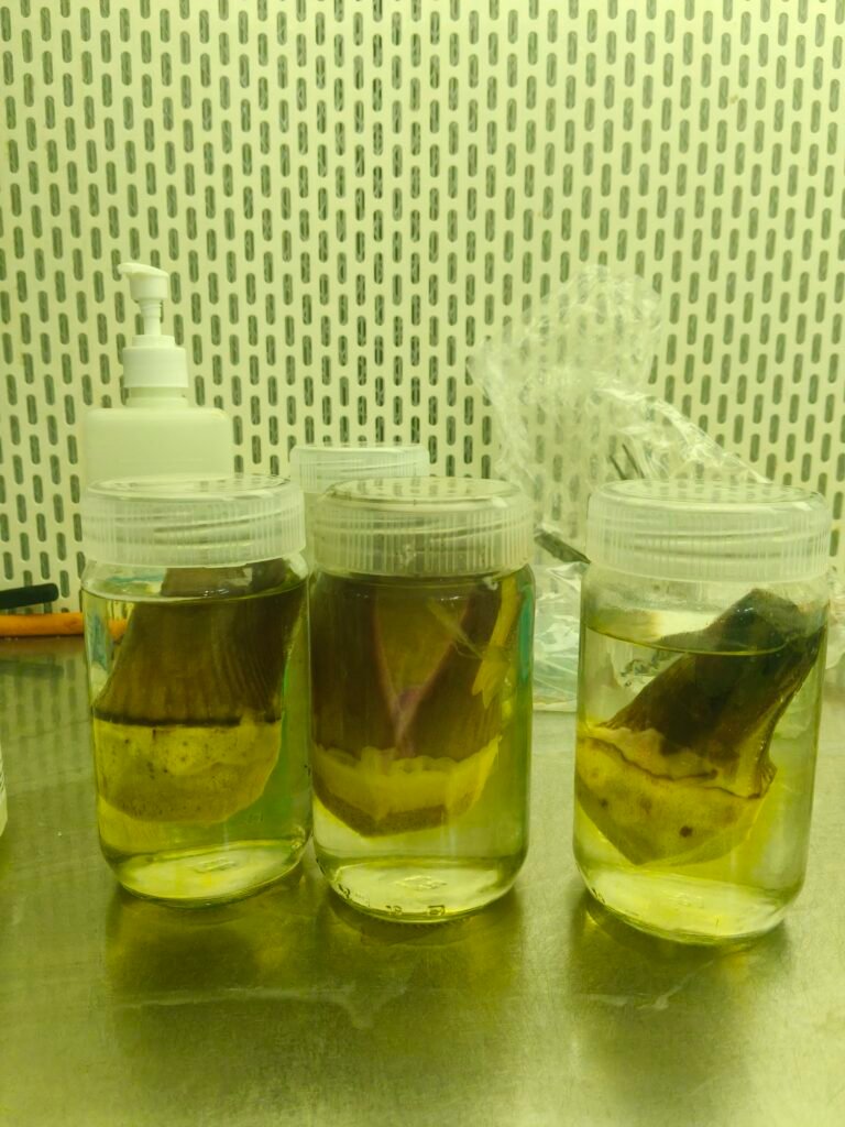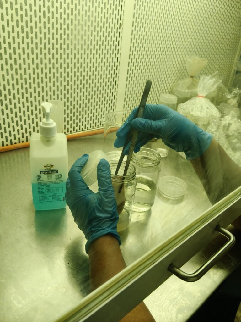 11. Prepare 1% sodium hypochlorite solution and taking sodium hypochlorite solution into a laminar air flow and soak the plant material in sodium hypochlorite solution for 15 minutes( for 1 jar 50ml sodium hypochlorite and 250ml sterile distilled water).