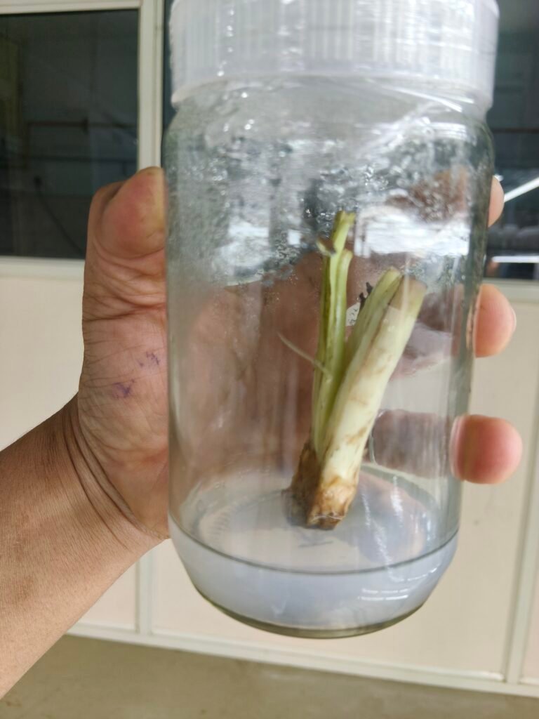 2 healthy banana sucker explants were collected from the field. The explants were thoroughly washed and surface sterilized using appropriate sterilizing agents. After rinsing with sterile distilled water, the explants were inoculated onto Murashige and Skoog (MS) medium under aseptic conditions inside a laminar airflow cabinet.