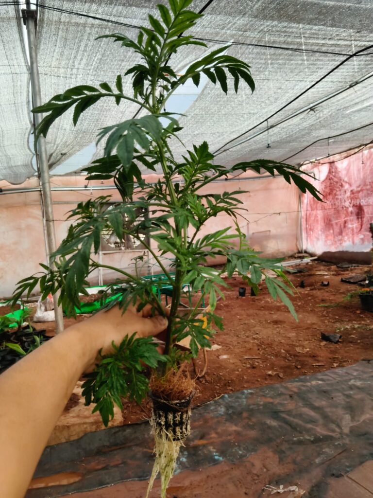 After 4 days, the plant growth looked good and the roots were also well developed. However, pest infestation started appearing on the marigold plants. The pests from the capsicum plants in the polyhouse had spread to the marigold plants. It was necessary to control them, so I applied a spray of neem oil.