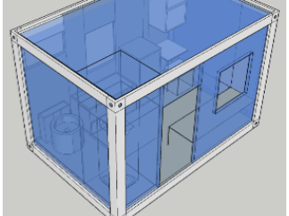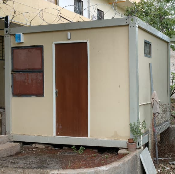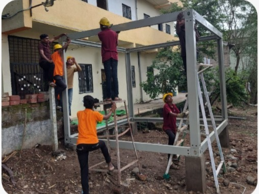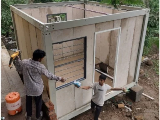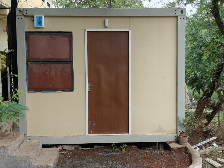 The structural frame is fabricated using mild steel square tubes, while wall panels are made using insulated sandwich panels / plywood with thermal insulation to maintain indoor comfort. The roofing system is designed to withstand local climatic conditions and provide rainwater protection.