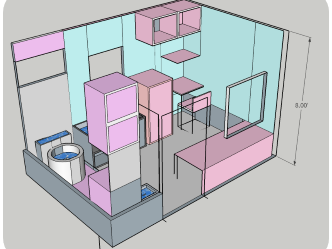 The unit includes provisions for sleeping space, compact storage, workspace / kitchenette area, and ventilation openings for natural light and airflow.