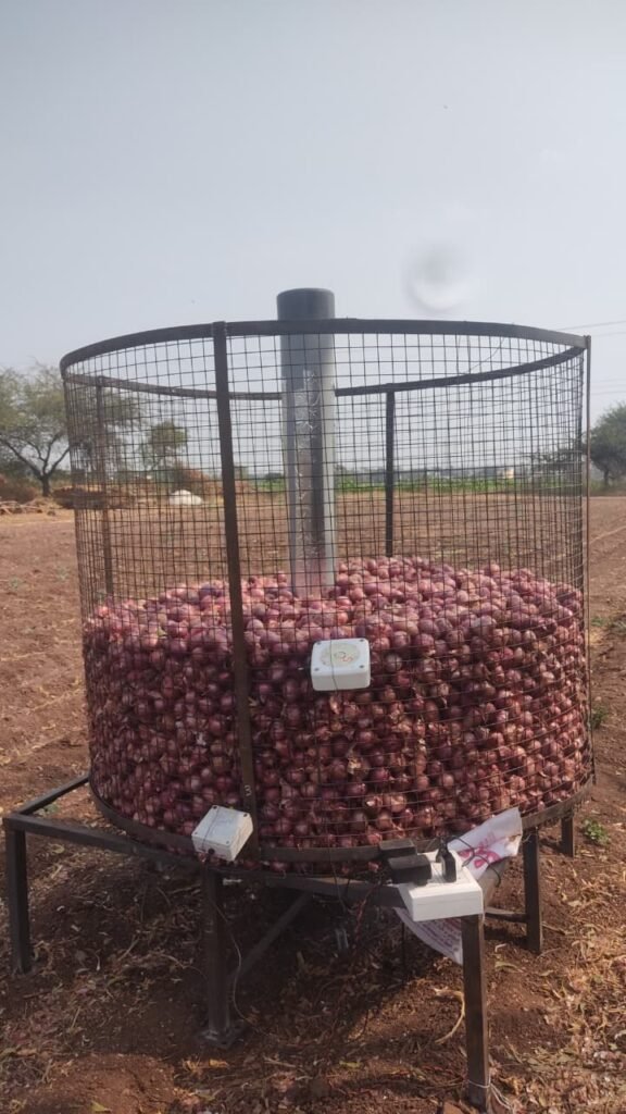 To overcome the problems in traditional onion storage systems, we developed a prototype that focuses on improving ventilation and extending the shelf life of onions. The design consists of a cylindrical structure made using wire mesh, placed on an elevated platform to allow proper airflow from all sides. At the center of the structure, an air duct is installed and connected to a blower. This blower pushes air from inside the storage unit to the outside, ensuring continuous and uniform ventilation throughout the structure. This arrangement helps maintain suitable storage conditions and reduces the chances of spoilage.