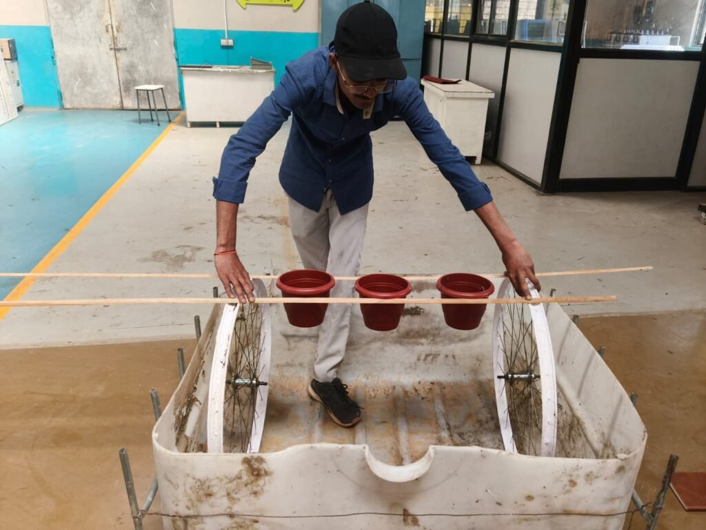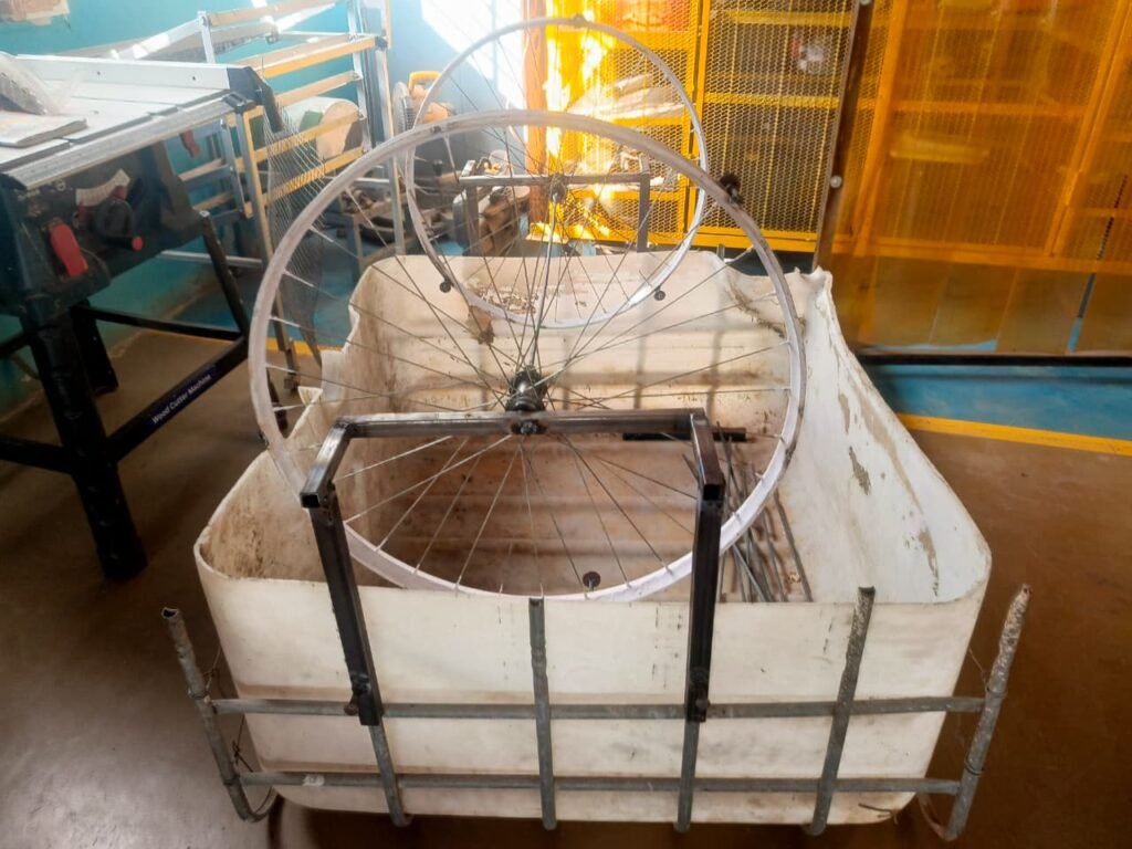 Bicycle wheels have been mounted and connected using a shaft to create the rotating mechanism. Tank is used as the base reservoir, and two bicycle wheels are mounted on a central shaft. A metal frame supports the structure and keeps the wheels aligned. This setup forms the foundation of the rotating system, which will later be used to hold plant pots and enable smooth rotation.